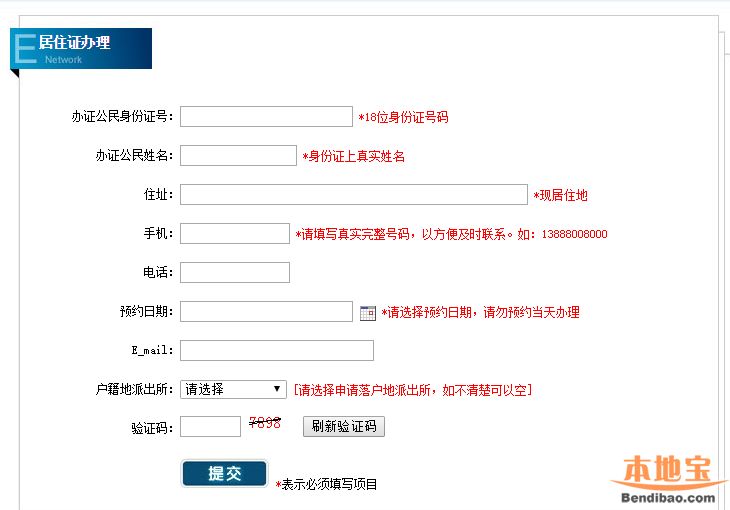 所需填寫的信息包含:辦證公民身份證號、辦證公民姓名、住址、手機、電話、預約日期、E_mail、戶籍地派出所、驗證碼;