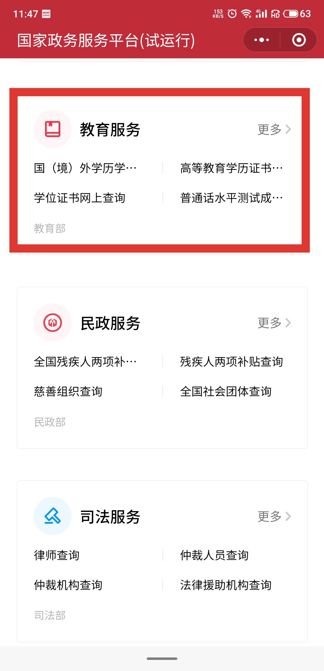 第一步:進(jìn)入百度,搜索國(guó)家政務(wù)服務(wù)平臺(tái)小程序,進(jìn)入小程序,找到教育服務(wù),點(diǎn)擊『更多』