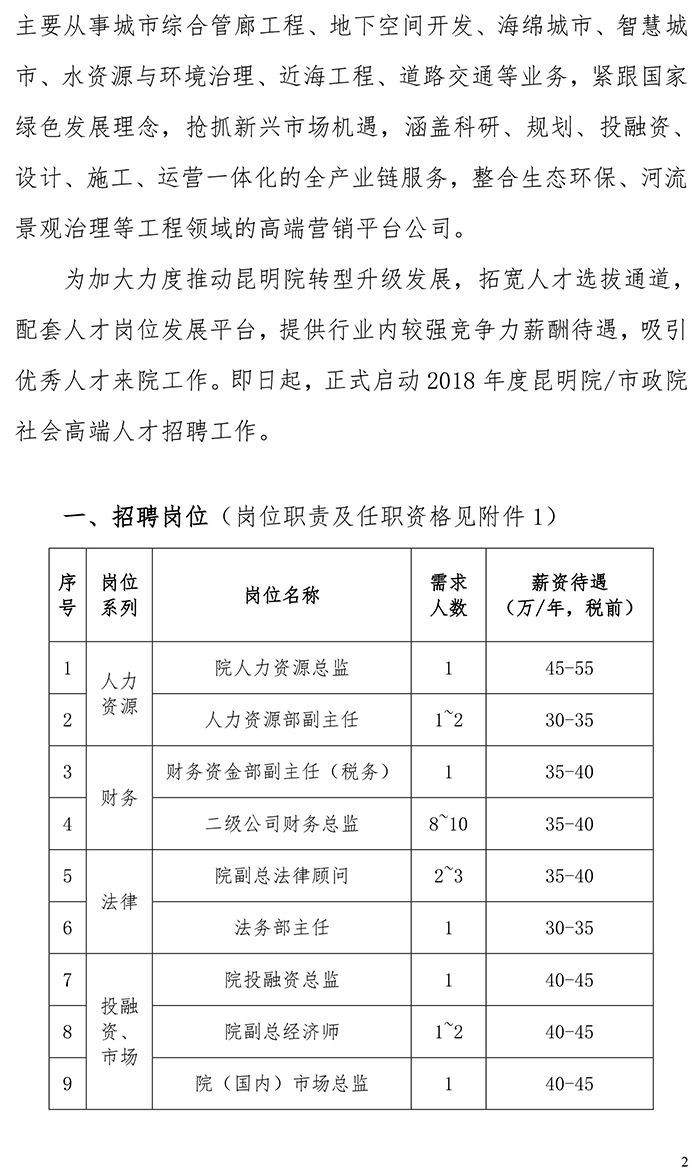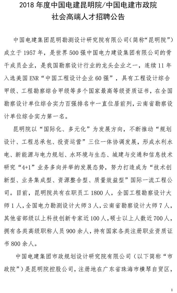 2018年度中國(guó)電建昆明院/中國(guó)電建市政院社會(huì)高端人才招聘公告