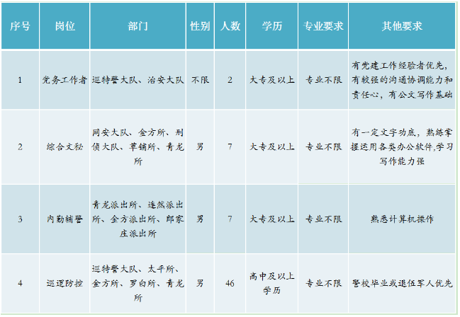 2.優(yōu)先招聘退役士官士兵、見義勇為積極分子和先進個人、政法類和警察類院校畢業(yè)生;