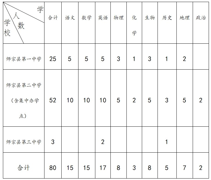 為加強(qiáng)師宗縣教師隊(duì)伍建設(shè),經(jīng)縣委、縣政府同意,曲靖市師宗縣教育體育局決定面向全國(guó)師范大學(xué)類本科大學(xué)(不包含師范類學(xué)院)(名單見(jiàn)附件1)2020年畢業(yè)的優(yōu)秀學(xué)生,公開(kāi)招聘中學(xué)教師80名,現(xiàn)公告如下。