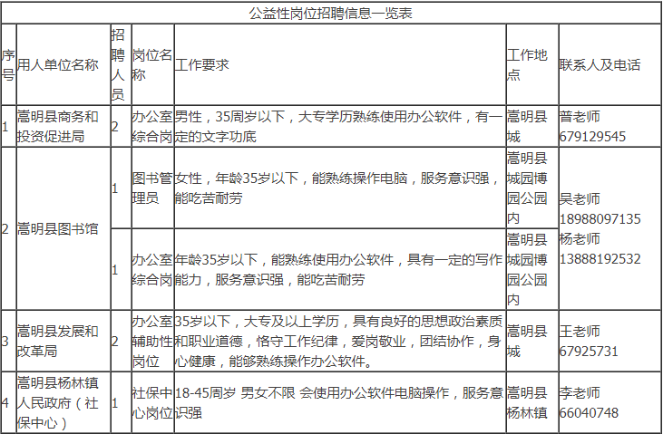 招聘具體事宜請咨詢用人單位。符合公益性崗位上崗條件的個人也可以到嵩明縣勞動就業(yè)服務(wù)局綜合科申請公益性崗位求職登記,詳詢陳老師:0871-67917444。
